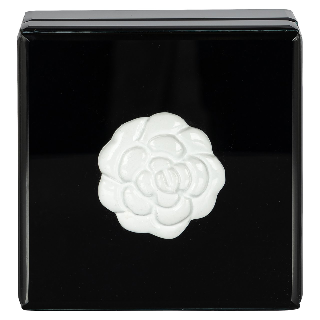 Deze elegante opbergdoos combineert een diepe zwarte tint met subtiele witte accenten, waardoor een tijdloos en verfijnd design ontstaat.