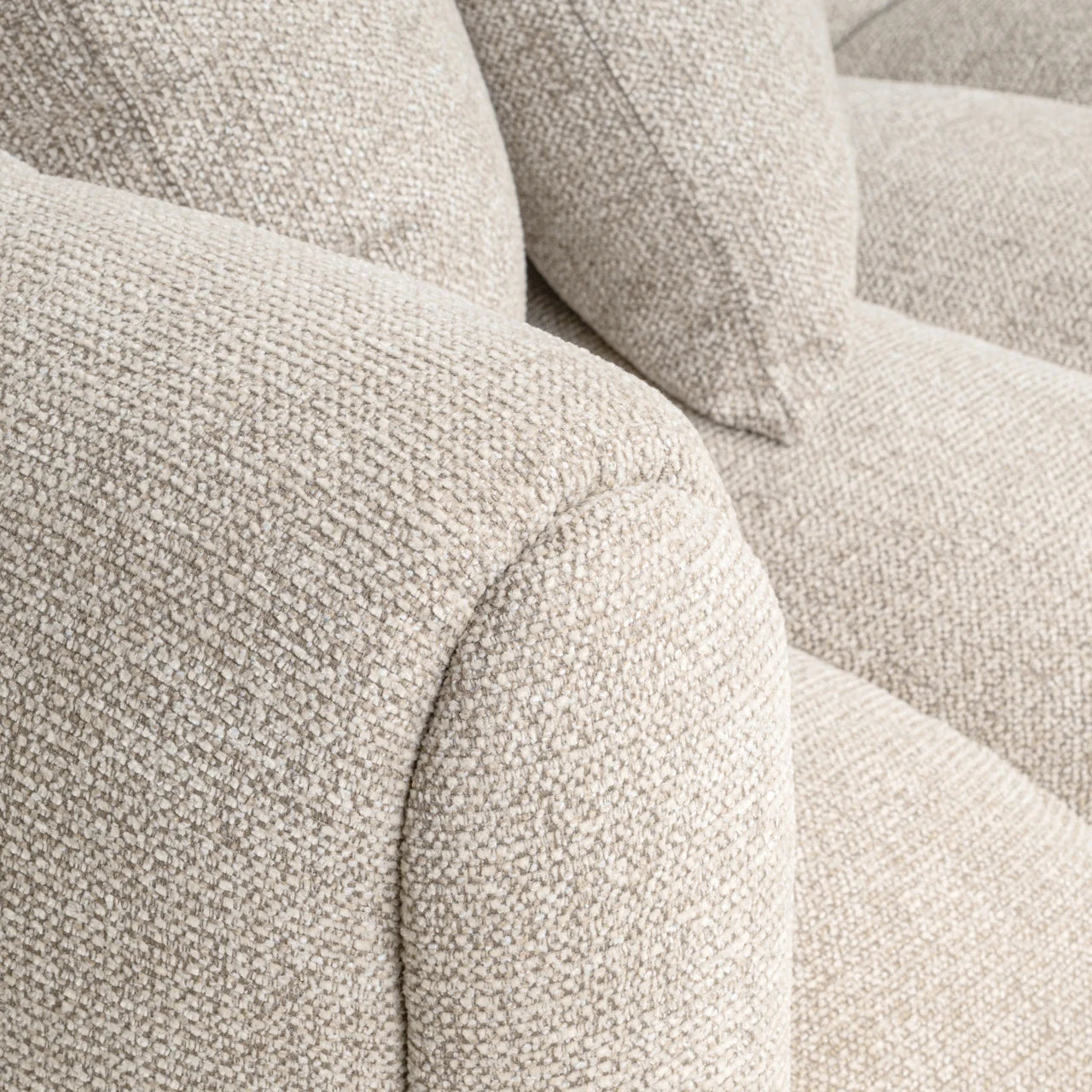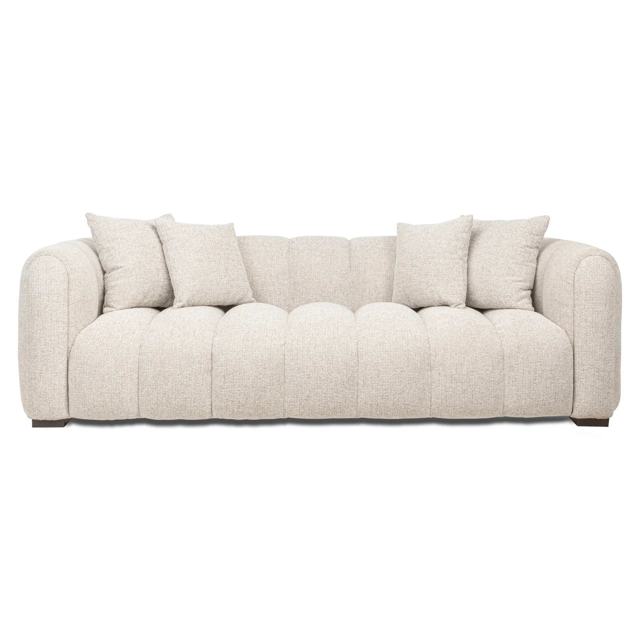 Deze sofa heeft een rechte, ruime vorm met een evenwichtige en rustige uitstraling. De zitting en rugleuning ogen breed en comfortabel, met zachte lijnen die zorgen voor een ingetogen belijning. De bekleding toont een lichte, natuurlijke kleurindruk met een matte textuur. Door het uitgebalanceerde ontwerp past de sofa goed binnen moderne en serene woonruimtes.