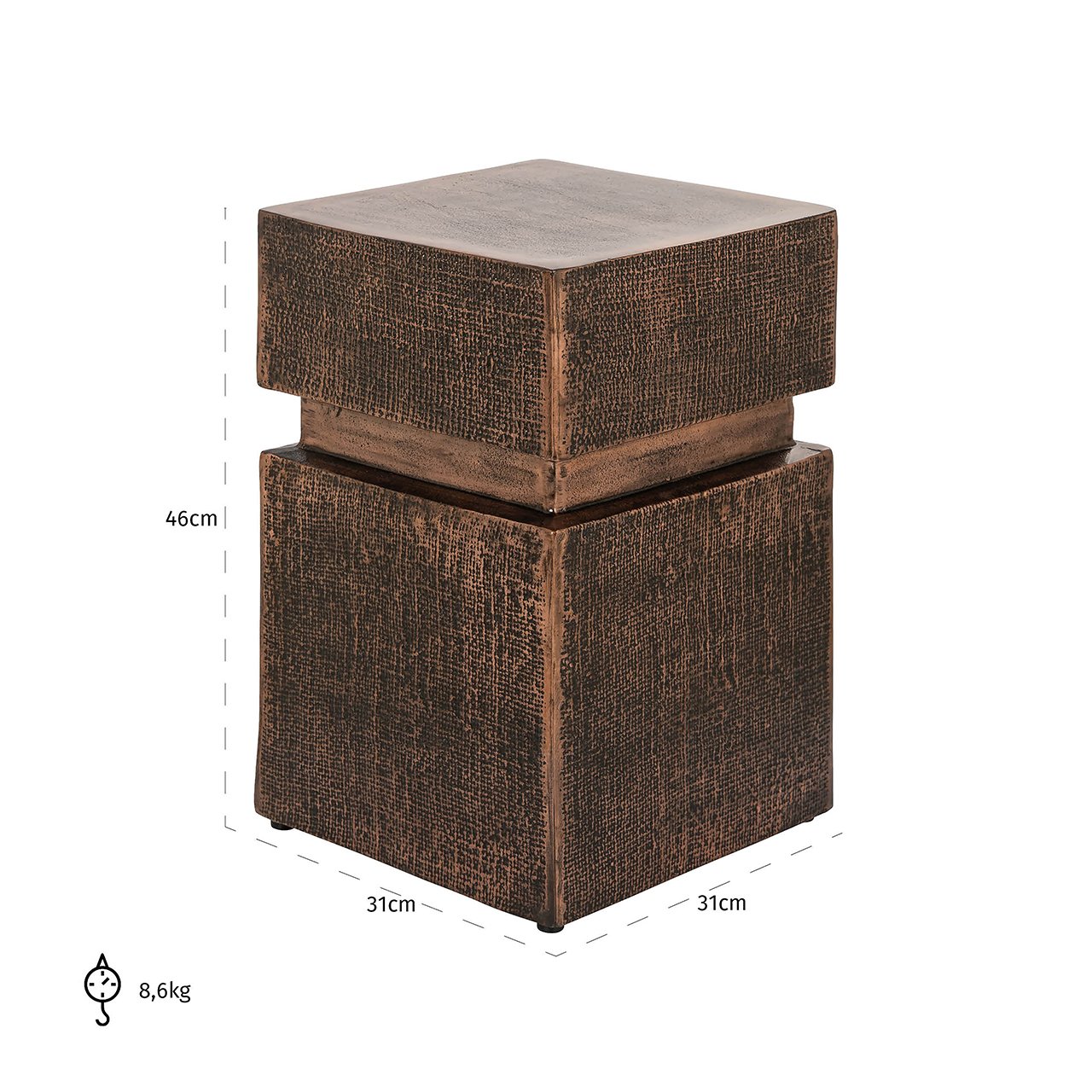 Bijzettafel Nox is een stijlvolle toevoeging aan elke woonruimte, vervaardigd uit koperkleurig aluminium. Het tijdloze design gecombineerd met de glanzende koperen afwerking maakt het een opvallend en elegant meubelstuk. Deze tafel is niet alleen esthetisch aantrekkelijk, maar ook duurzaam en stevig.