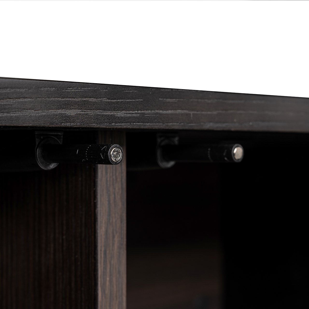 Het prachtige Dressoir Dax heeft een eigentijds ontwerp van eiken fineer in de kleur ‘charcoal’ zwart, met daarnaast twee van de vier deuren afgewerkt in geborsteld goud.