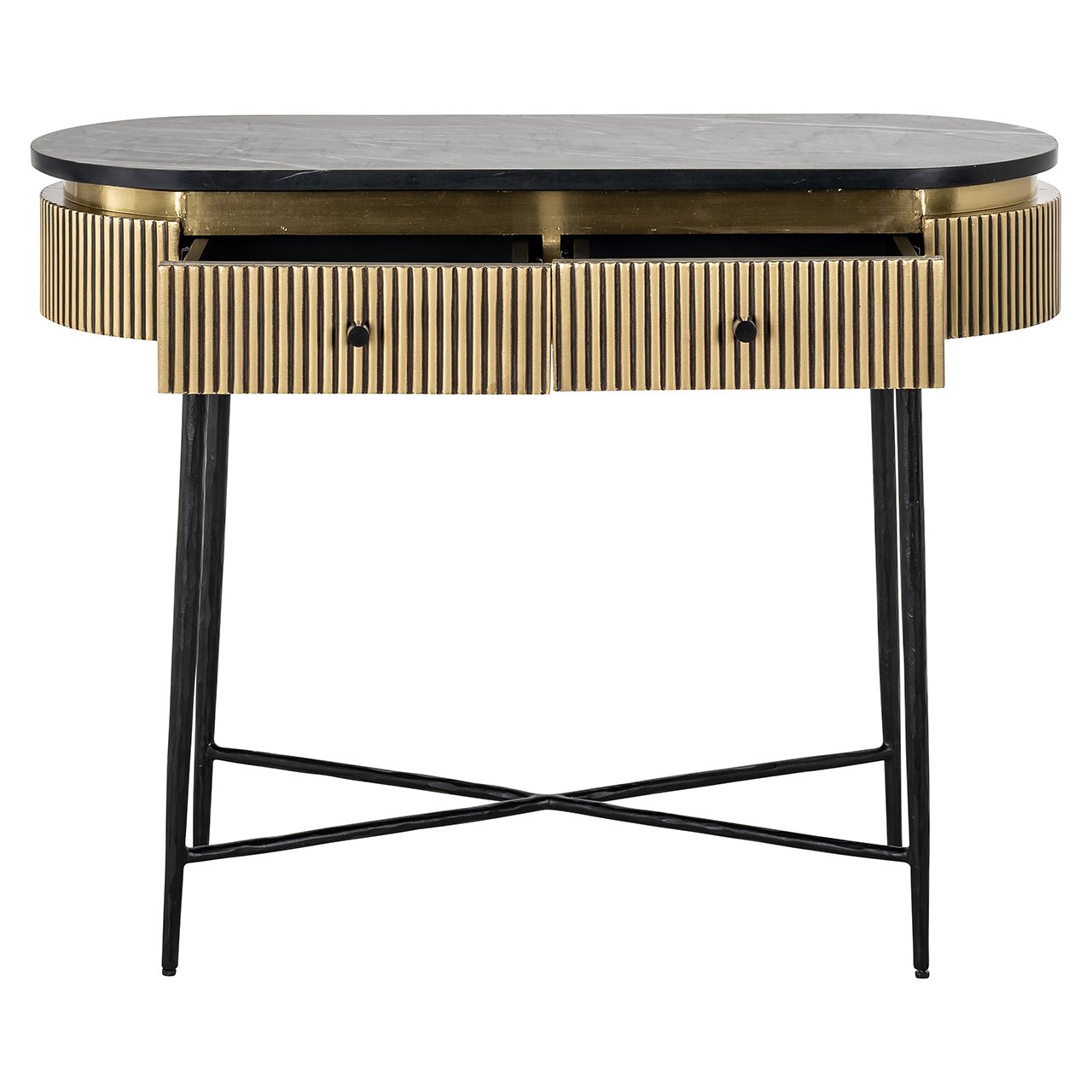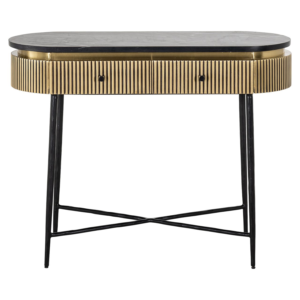 De Wandtafel Ironville brengt een tijdloze elegantie naar uw interieur, gekenmerkt door een authentiek marmeren blad en verfijnde gouden accenten.