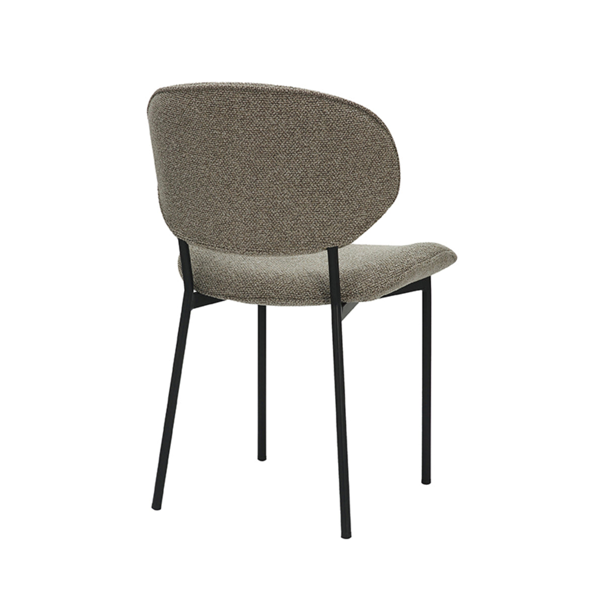 Eetkamerstoel Senn van LABEL51 geeft een minimalistische en eigentijdse toevoeging aan elke eetkamer. De stoel is uitgevoerd in de luxe stof royal bouclé in de kleur Mushroom, wat zorgt voor een zachte, comfortabele zitervaring en een warme, neutrale uitstraling met een vleugje taupe. Het strakke en eenvoudige ontwerp, gecombineerd met de organisch gevormde zitting en rugleuning, geeft de stoel een subtiele elegantie. De slanke, zwarte metalen poten vormen een stijlvol contrast met de zachte mushroom bekleding, wat bijdraagt aan het moderne en minimalistische karakter van de stoel.