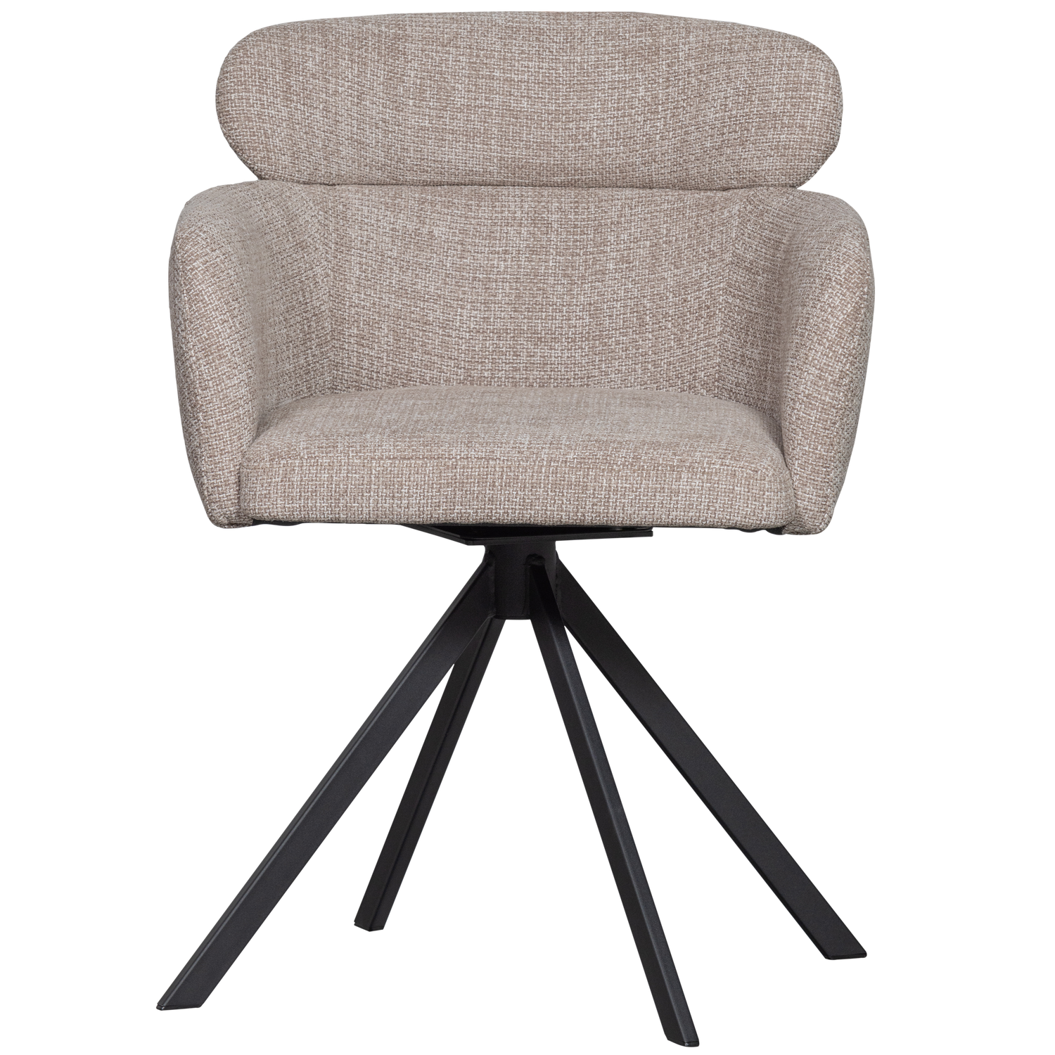 Stijlvolle en comfortabele eetkamerstoel met draaipoot bekleed met geweven stof van 100% polyester. Het metalen onderstel in zwart geeft een moderne look.