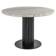 Eettafel Nyon heeft een rond blad van Toronto-marmer gecombineerd met een donkere houten basis.