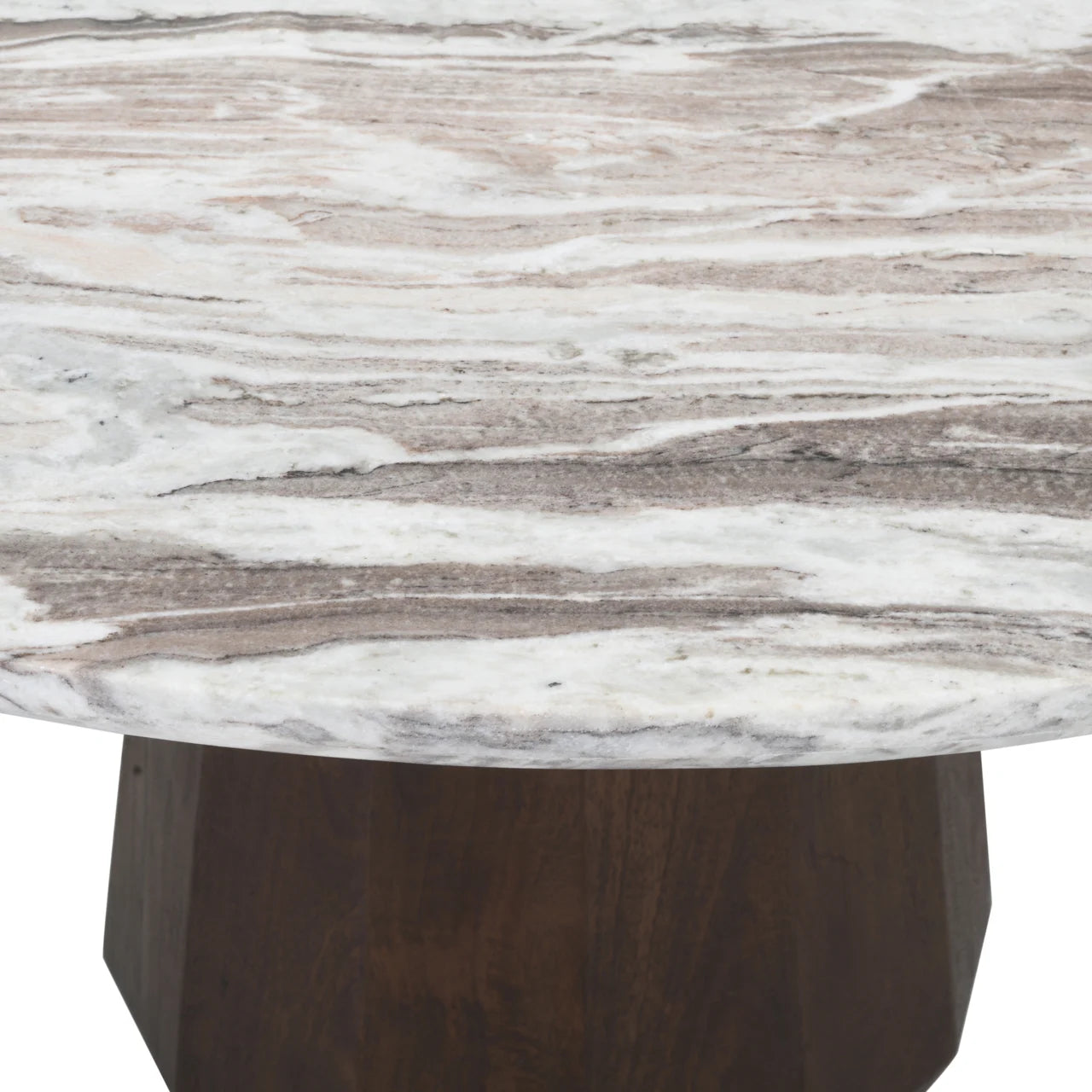 De eettafel Oberoy (130 cm) straalt natuurlijke luxe uit met een prachtig tafelblad van Toronto marmer en een robuuste voet van mangohout.