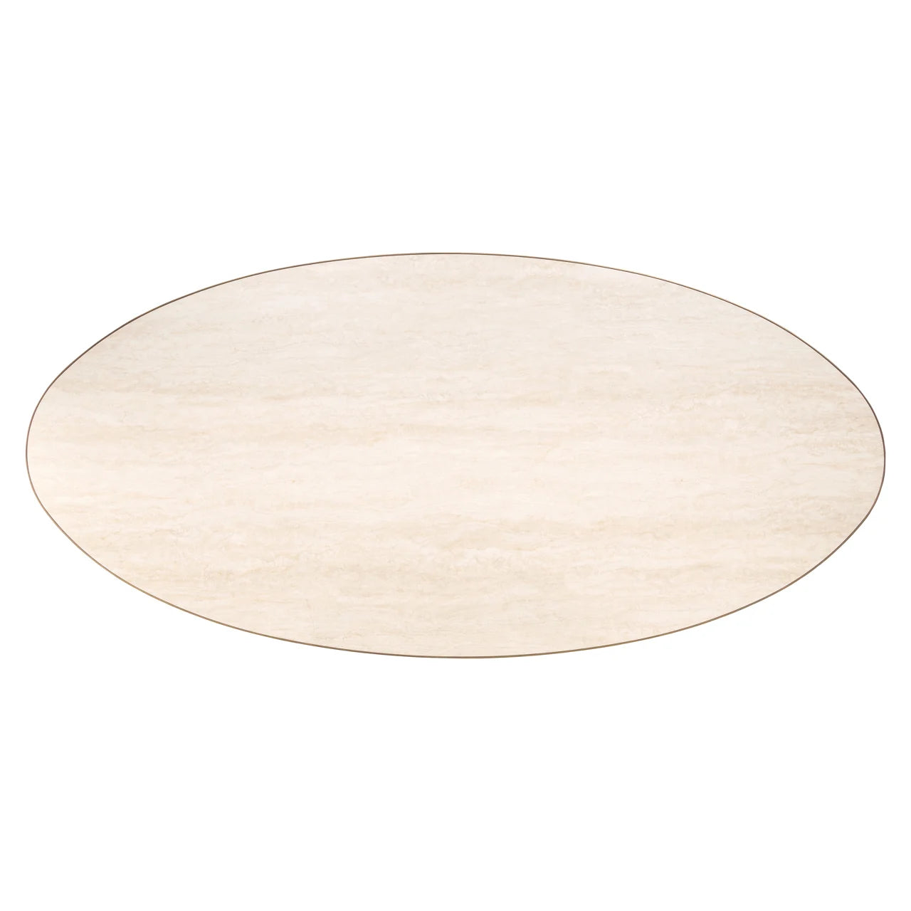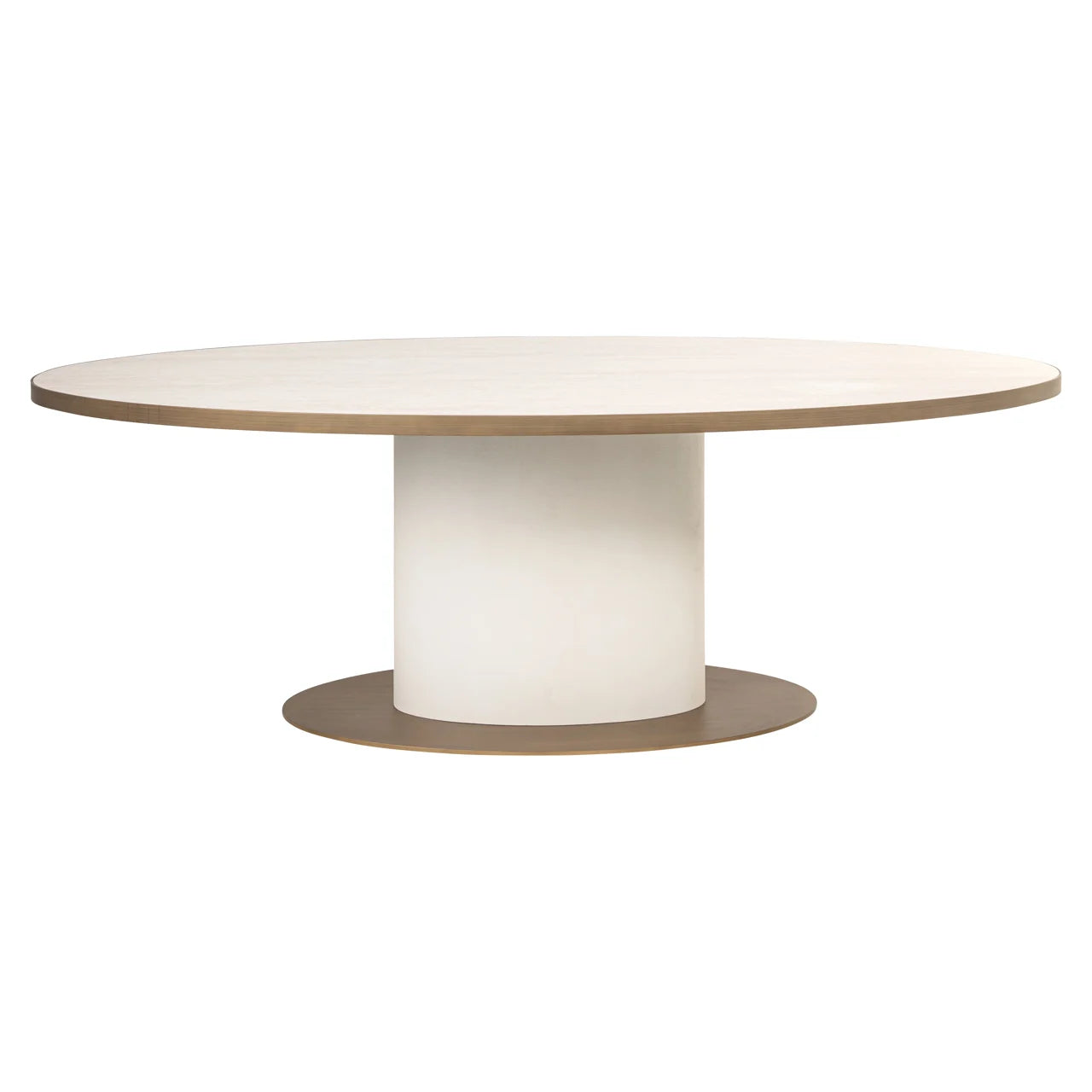 De ovale Tivoli eettafel in wit heeft een gladde, langgerekte poot die de vloeiende, verfijnde vorm benadrukt.