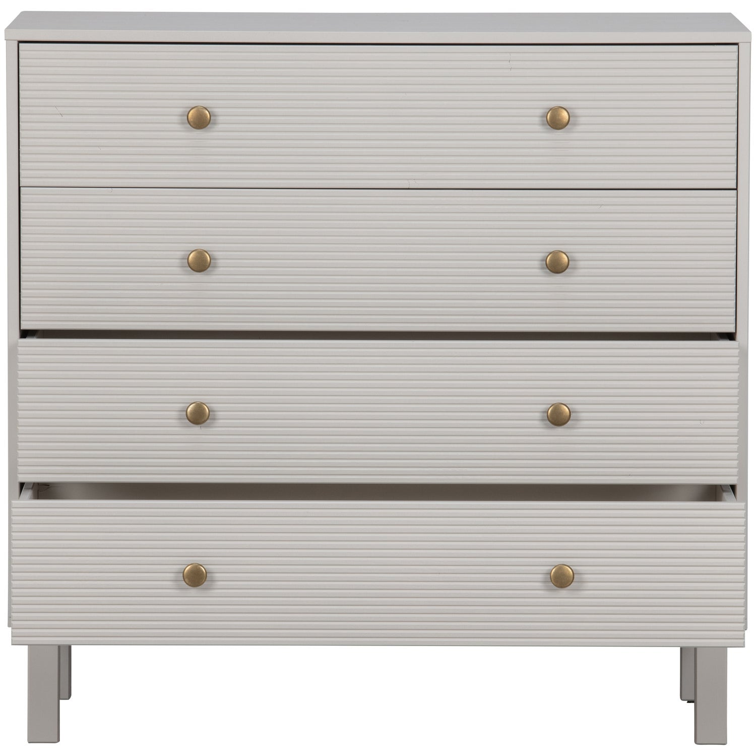 Stijlvolle Ladekast Combinatie Van Grenenhout En Metaal Veel Opbergruimte: Voorzien Van 4 Royale Laden H 91 Cm X B 94 Cm X D 52 Cm Madu Is Een Stijlvolle, Moderne Ladekast Uit De Collectie Van Het Nederlandse Merk Woood. Madu Is Vervaardigd Uit Grenenhout Met Een Wolkengrijze Afwerking. Dit Geeft De Kast Een Tijdloze Uitstraling. De Goudkleurige Knoppen In Combinatie Met Het Lichtgekleurde Grenenhout Geven De Kast Tevens Een Moderne En Stoer Karakter. Madu Is Voorzien Van Vier Royale Laden Met Goudkleurige Knopjes. De Inhoud Van De Laden Hebben Een Breedte Van 86 Cm En Een Diepte Van 38 Cm. Plaats Bij Harde Vloeren Viltglijders Onder De Poten. Dit Voorkomt Beschadigingen Aan De Vloer. Het Artikel Wordt Geleverd Als Eenvoudig Bouwpakket Met Een Duidelijke Montage Instructie.