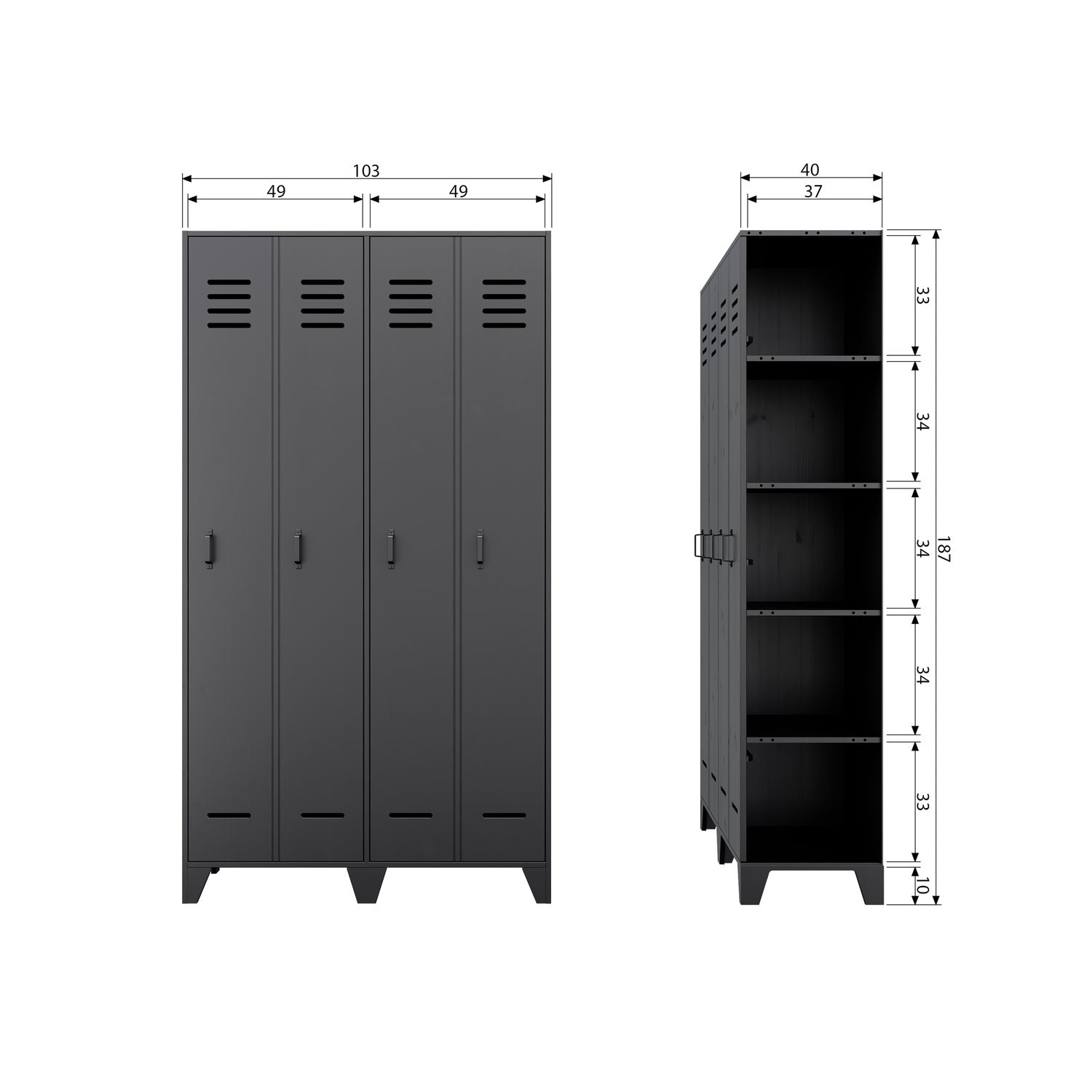 Stijn Is Een Nieuwe Serie Lockerkasten Van Woood. En Stel Stoere Exemplaren Uitgevoerd In Het Massief Grenen In De Kleuren Zwart, Staalgrijs En Het Frisse Wit. Deze Royale 2 Deurs Lockerkast Is Een Ware Opberger. Achter Iedere Deur Bevinden Zich 4 Legplanken. Om Een Leuk Locker Effect Te Geven Lijkt Het Net Of Er 4 Deuren In Zitten, Voor Het Gemak Zijn Dit Twee Grotere Deuren. Deze Kast Is Ideaal Voor In De Slaapkamer, Maar Ook Erg Trendy Voor Op Een Kantoor. De Kast Wordt Geleverd Als Eenvoudig Bouwpakket Met Een Duidelijke Montage Instructie.