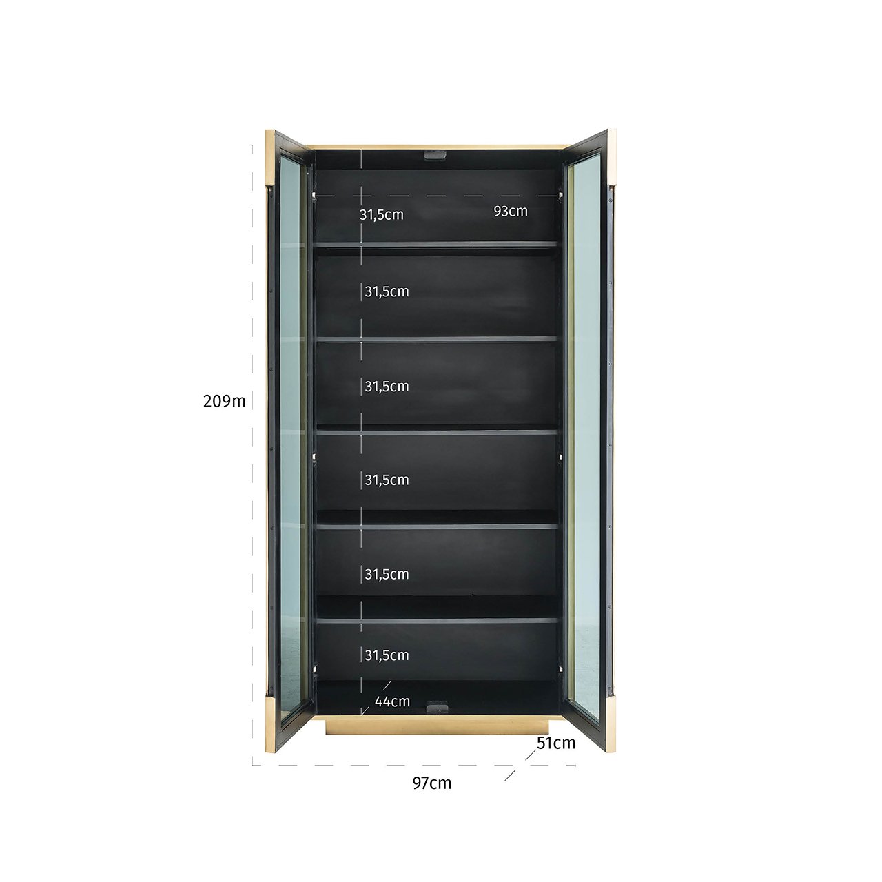 De Finsbury wandkast heeft twee deuren en is vervaardigd met een combinatie van messing bekleding, MDF, en glas. De messing bekleding geeft de kast een elegante en luxe uitstraling, terwijl de glazen deuren een moderne touch toevoegen en de inhoud van de kast subtiel zichtbaar maken. De MDF-constructie zorgt voor duurzaamheid en stevigheid. Deze wandkast is een verfijnde keuze voor het opbergen en tentoonstellen van decoratieve items in een stijlvol interieur.