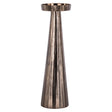 Deze kandelaar heeft een slanke verticale vorm met een stabiele basis. De afwerking toont een bronzen kleur met een subtiele glans, wat zorgt voor een warme uitstraling. Door de evenwichtige verhoudingen en het rustige ontwerp is dit object geschikt voor plaatsing op een tafel, dressoir of console.