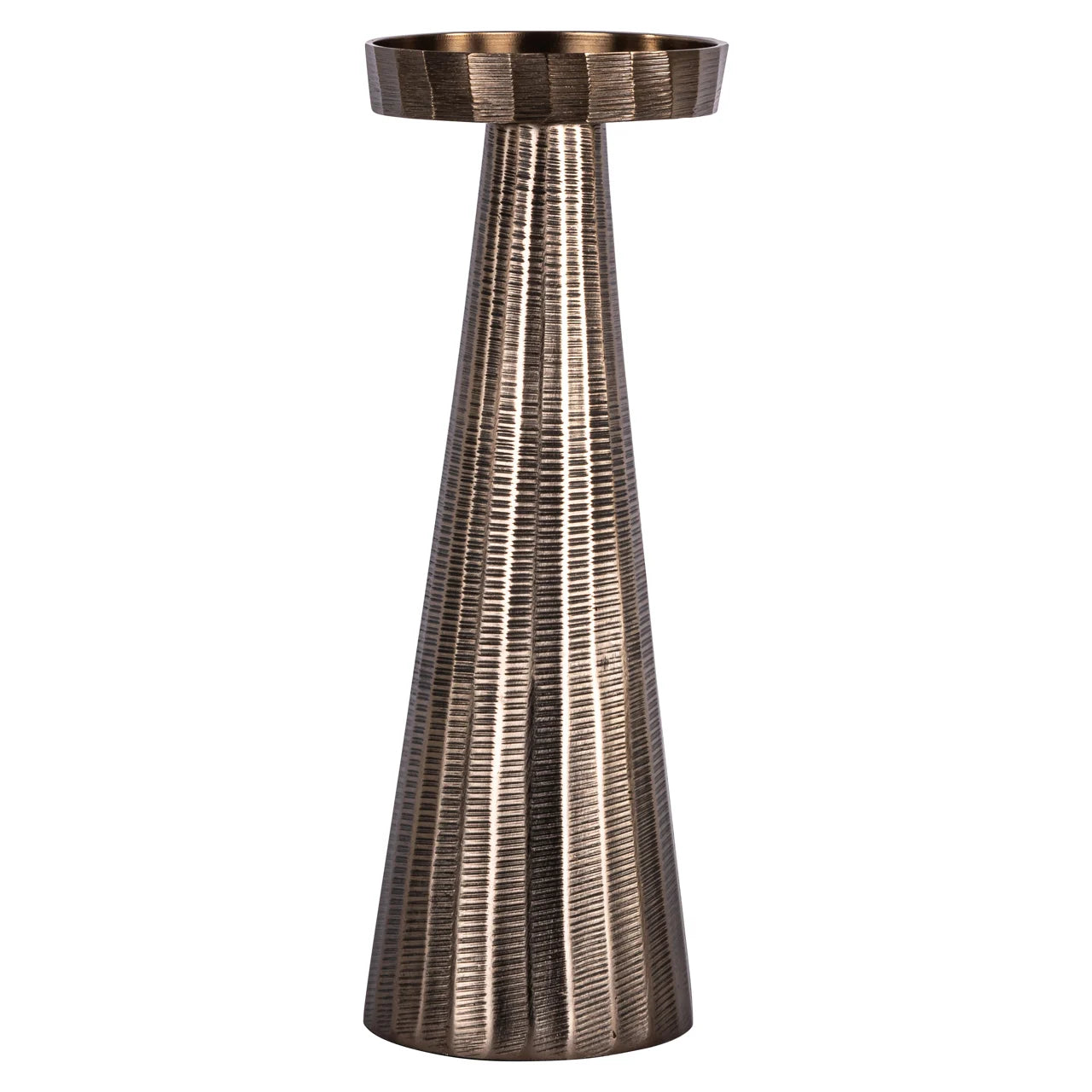 Deze kleine kandelaar heeft een compacte vorm met een duidelijke verticale opbouw. De afwerking toont een bronzen kleur met een zachte glans wat zorgt voor een warme uitstraling. De lijnen zijn eenvoudig en evenwichtig waardoor de kandelaar geschikt is voor plaatsing op een tafel dressoir of open plank. Het ingetogen ontwerp laat zich goed combineren met andere decoratieve objecten.