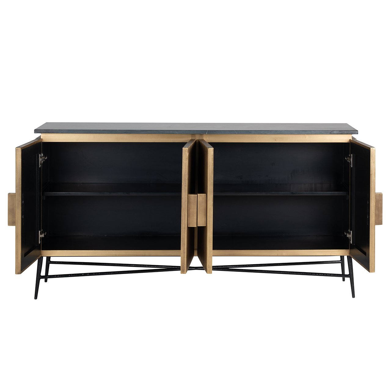 Dressoir Ironville 4-deuren is een uniek dressoir in goud / messing met geribbeld relief en zwart marmeren blad.