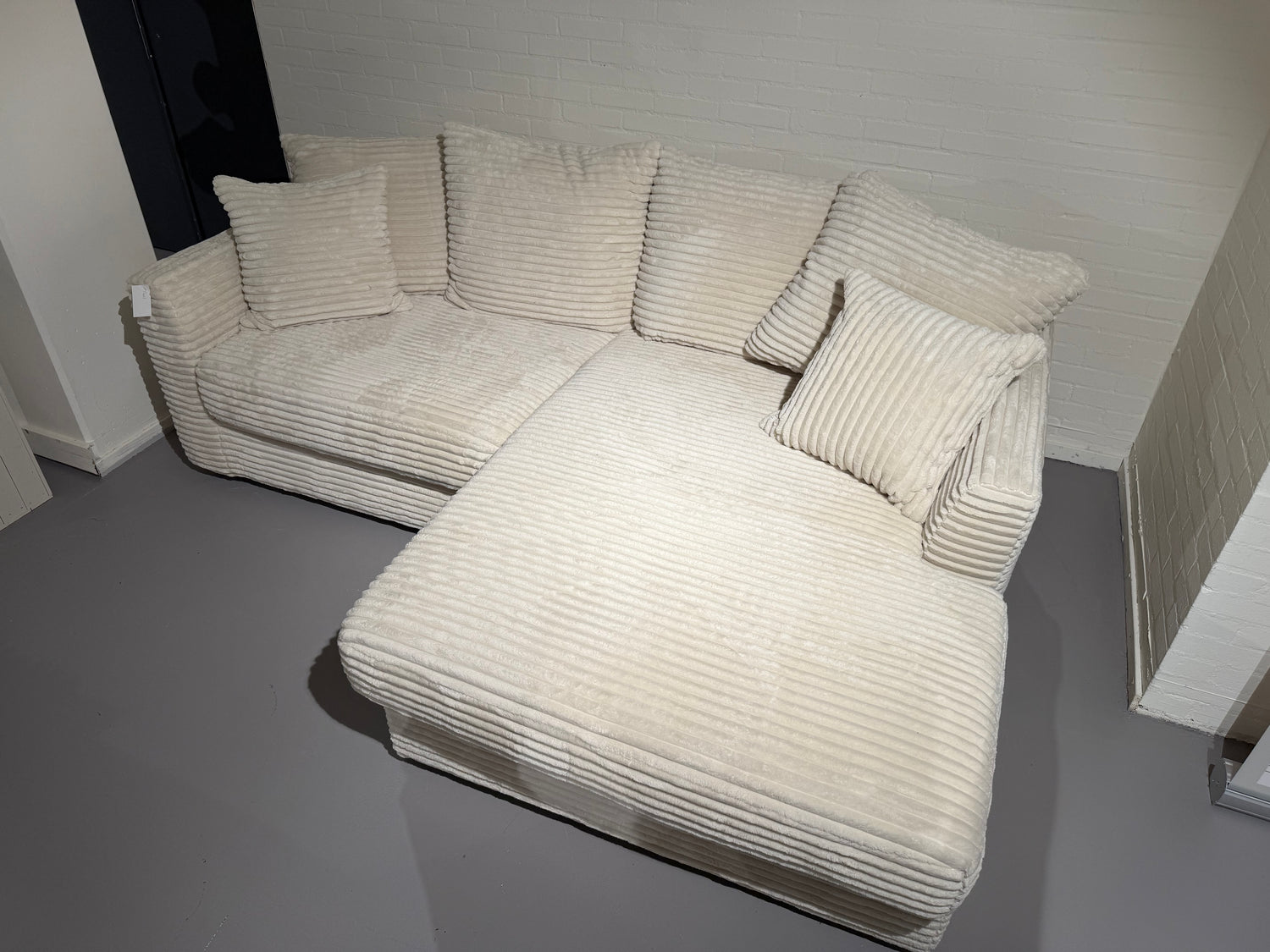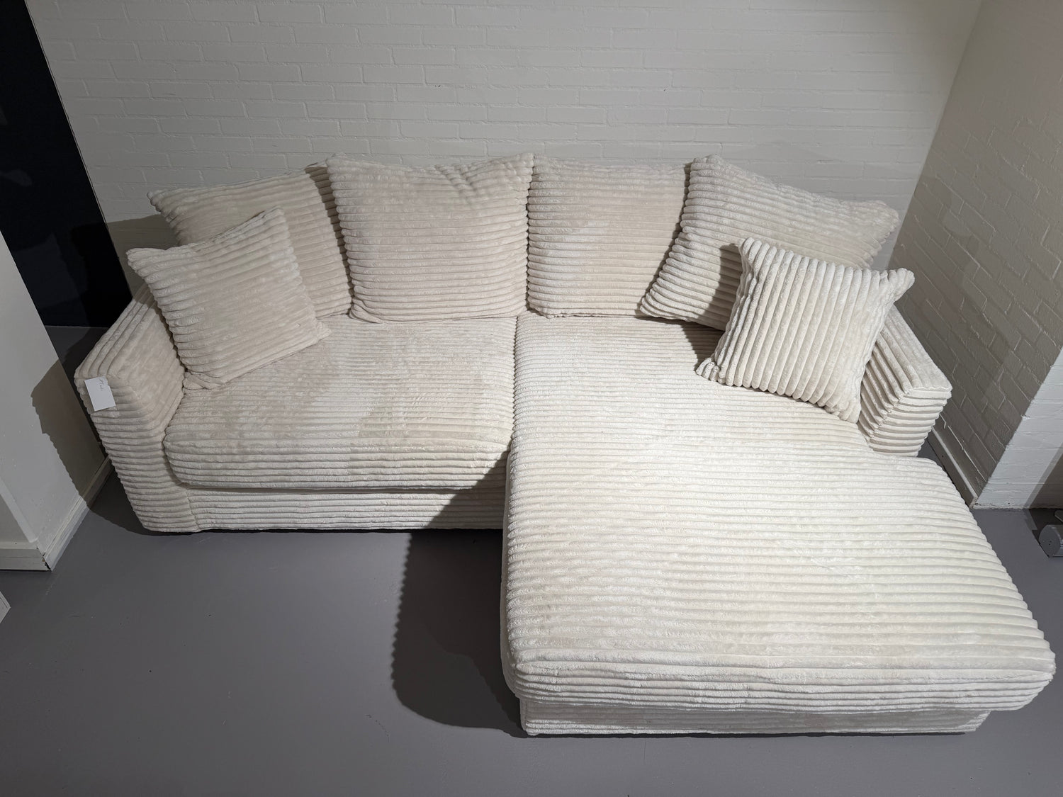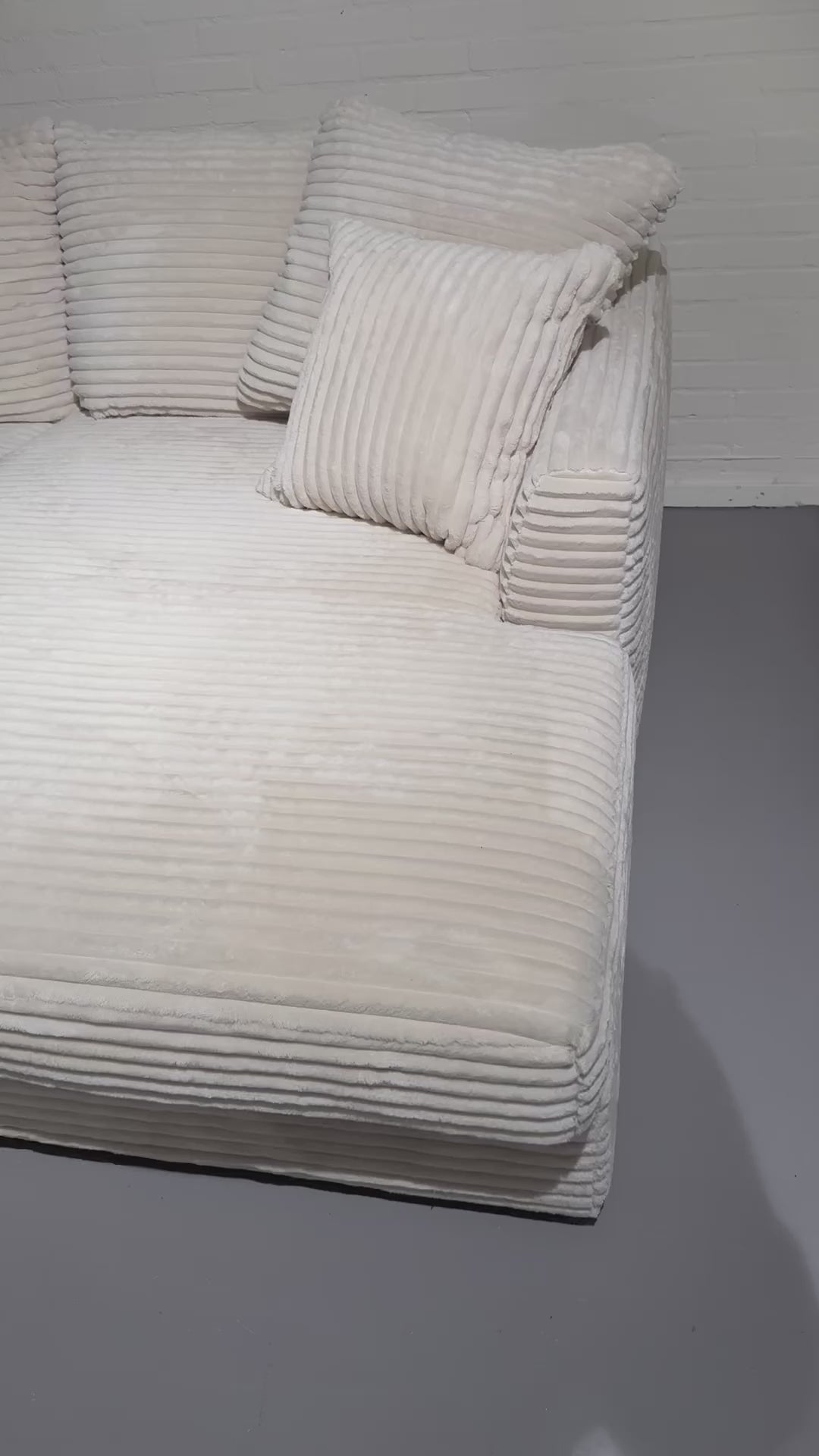 Deze bank straalt luxe en comfort uit met zijn stijlvolle ribfluwelen bekleding in een zachte, neutrale tint. Het ontwerp combineert moderne elegantie met een knusse uitstraling, waardoor hij perfect past in zowel een strak ingerichte ruimte als een warm, gezellig interieur.