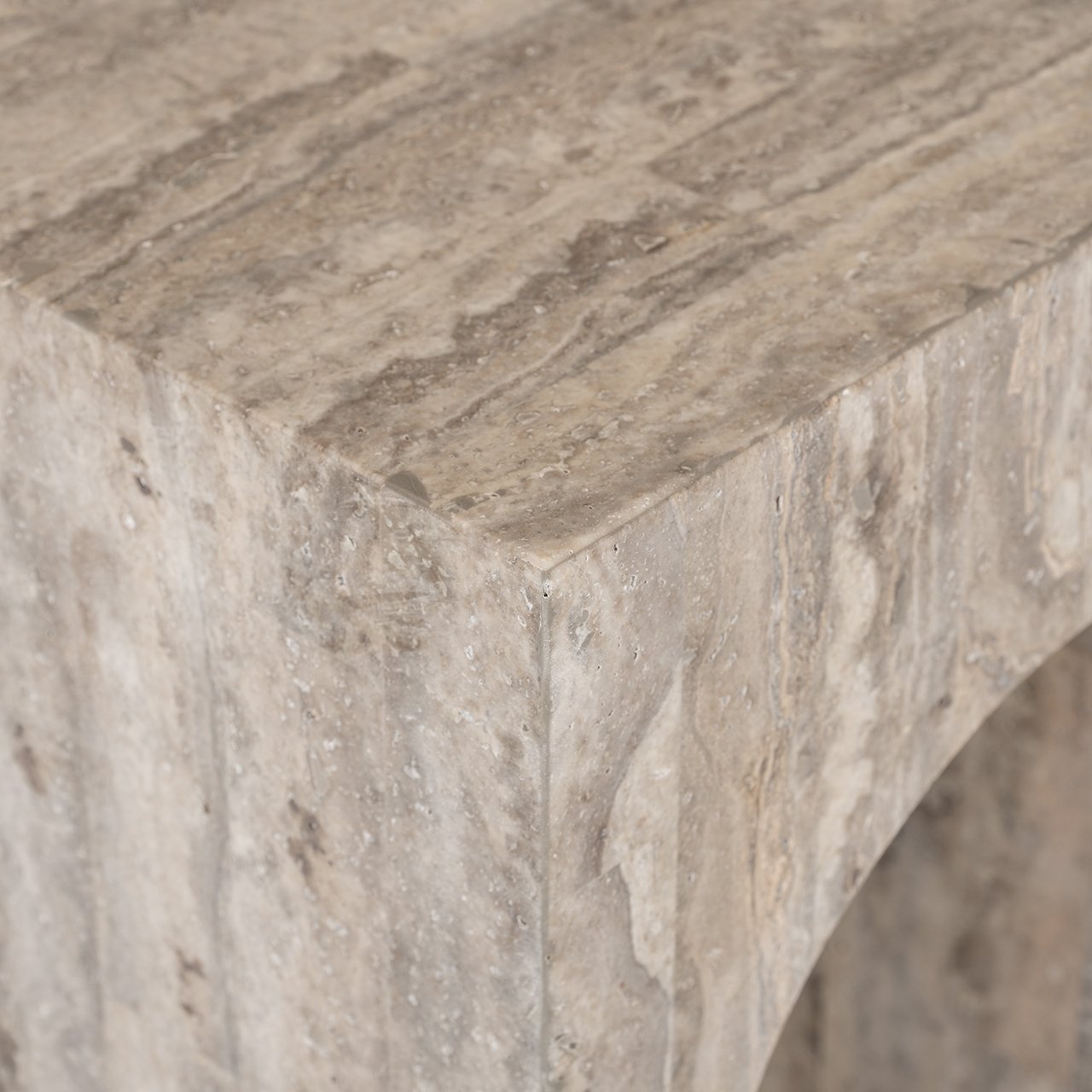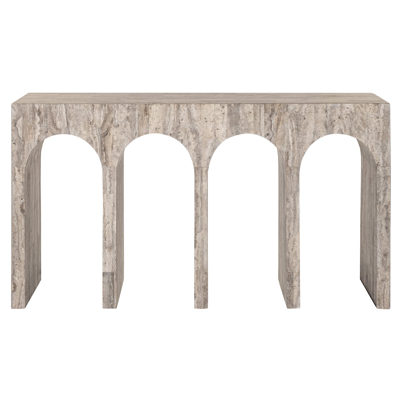 De La Rague wandtafel is een elegant meubelstuk, vervaardigd uit een combinatie van travertin en glasvezel. Het ontwerp is geïnspireerd op klassieke architectuur, met vier bogen die de tafel een tijdloze en statige uitstraling geven. De natuurlijke grijze tint van het travertin voegt een rustieke charme toe, terwijl de glasvezelconstructie zorgt voor stevigheid en duurzaamheid. Deze wandtafel is een verfijnde toevoeging aan elk interieur, ideaal voor het tentoonstellen van decoratieve objecten of als stijlvol accent in de gang of woonkamer.