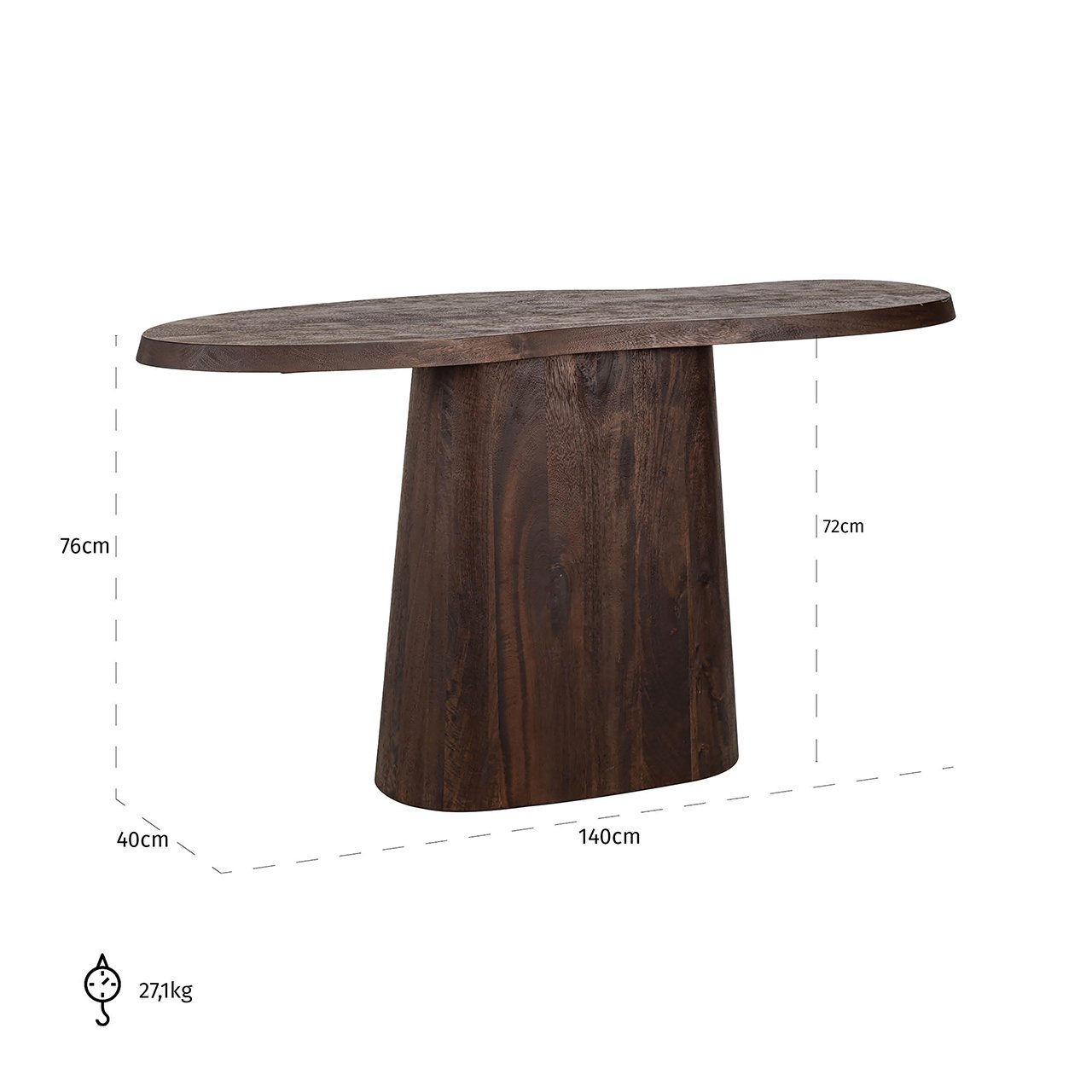De Wandtafel Odile is een functioneel en decoratief stuk dat aan de muur kan worden bevestigd. Met zijn mooie bruine mangohouten blad en stevige constructie biedt het een handige plek voor het tonen van familiefoto's of het opbergen van sleutels en post.