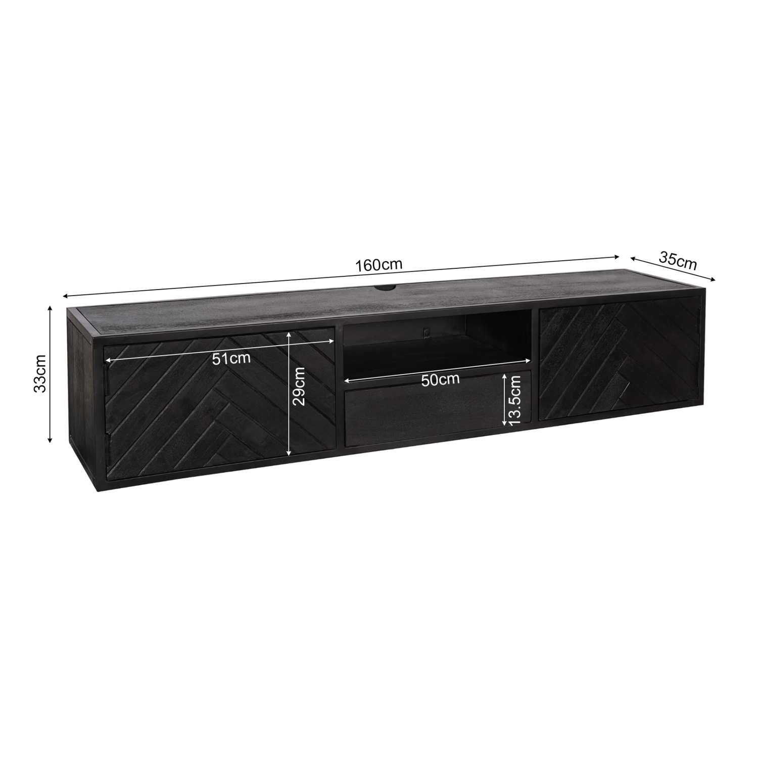 Dit stijlvolle zwevende TV-meubel is gemaakt van gezandstraald mangohout en afgewerkt met een moderne zwarte lak. De unieke visgraatpatroon aan de voorkant geeft een verfijnde touch, terwijl het open vak een praktische oplossing biedt om je spullen overzichtelijk en stijlvol op te bergen en tentoon te stellen. Een perfecte combinatie van elegantie en functionaliteit voor een strakke en moderne woonkamer! Let op: dit meubel wordt aan de muur bevestigd en is uitsluitend geschikt voor tv’s met een muurbevestiging. Afmetingen: Breedte: 160 cm Diepte: 35 cm Hoogte: 33 cm Onderhoud: Afnemen met een lichtvochtige doek.