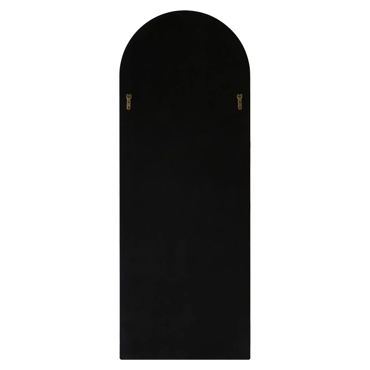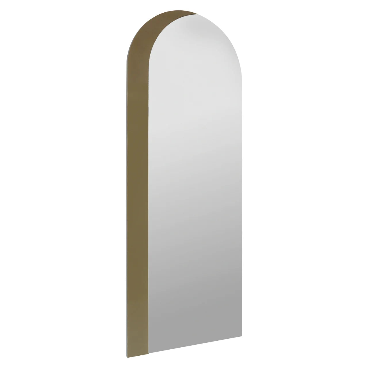 Deze spiegel heeft een afgeronde vorm met een verfijnde omlijsting in een zachte goudtint. De rand oogt gelijkmatig en rustig, wat bijdraagt aan een elegante uitstraling. Door het evenwichtige ontwerp past de spiegel goed binnen zowel moderne als meer klassieke interieurs.