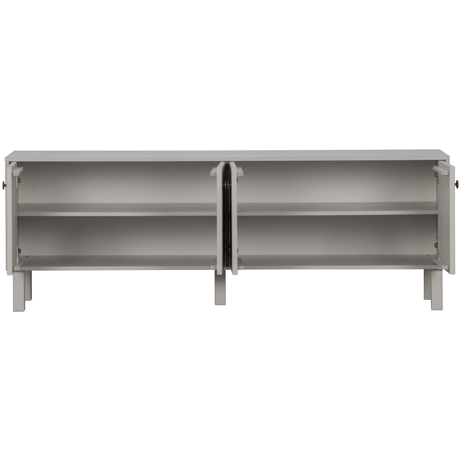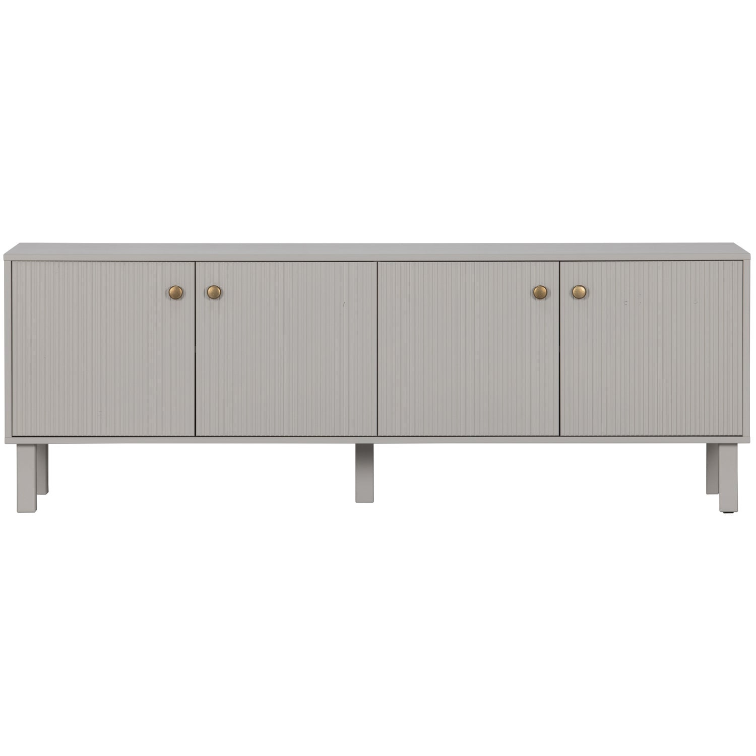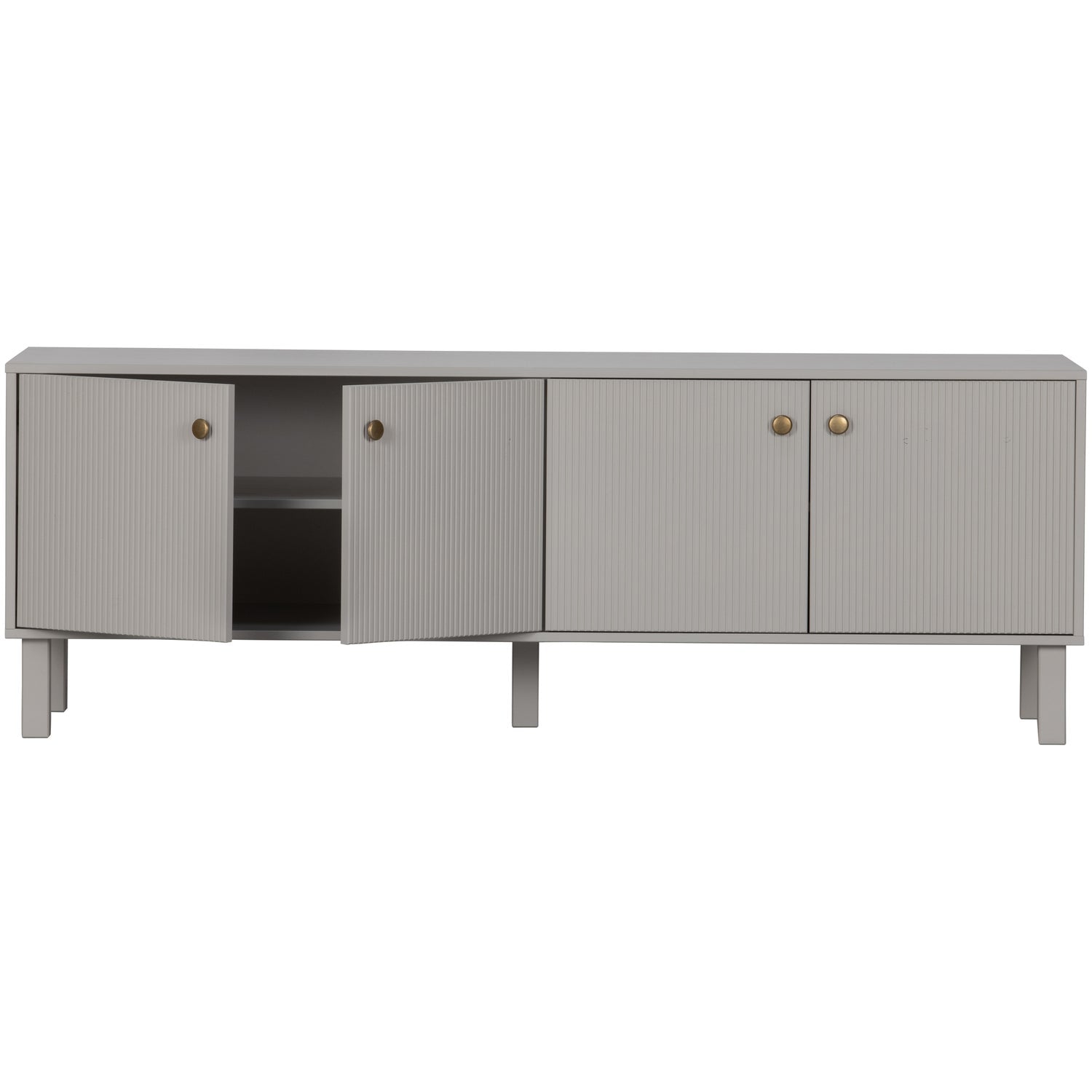 Stijlvol Tv Meubel Combinatie Van Grenenhout En Metaal Veel Opbergruimte: Voorzien Van 4 Legplanken H 56 Cm X B 160 Cm X D 46 Cm Madu Is Een Stijlvol, Modern Tv Meubel Uit De Collectie Van Het Nederlandse Merk Woood. Madu Is Vervaardigd Uit Grenenhout Met Een Wolkengrijze Afwerking. Dit Geeft De Kast Een Tijdloze Uitstraling. De Goudkleurige Knoppen In Combinatie Met Het Lichtgekleurde Grenenhout Geven De Kast Tevens Een Moderne En Stoer Karakter. Madu Is Voorzien Van Vier Deuren Met Goudkleurige Knopjes. Achter Deze Deuren Bevinden Zich 4 Legplanken. De Ruimtes Hebben Een Breedte Van 76 Cm En Een Diepte Van 43 Cm. Plaats Bij Harde Vloeren Viltglijders Onder De Poten. Dit Voorkomt Beschadigingen Aan De Vloer. Het Artikel Wordt Geleverd Als Eenvoudig Bouwpakket Met Een Duidelijke Montage Instructie.