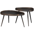 - Slanke bijzettafelset van twee op hoge poten - Tafelblad van multiplex met zinken metaalcoating - Metalen poten met een zandkleurige finish - H 39 cm x B 71 cm x D 52 cm / H 46 cm x B 54 cm x D 41 cm Diepzinnig en eigenaardig zijn twee kenmerken van deze interessante Crude bijzettafelset.